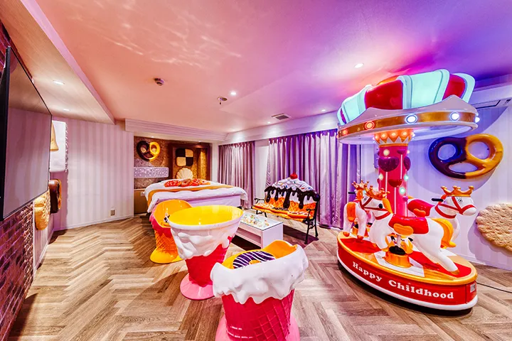 注目のルーム「405」は、ジェットコースターとウォータースライダーを備えている。また、「203」にはメリーゴーランドが、「407」にはバレルサウナ、そしてスワンベッドの「508」、貝殻「209」「309」「509」、アメ車ベッド「409」、庭園「406」など、非日常性のある設備や演出から、ゲストは宿泊そのものを「遊んで楽しむ」体験に満足をおぼえる。