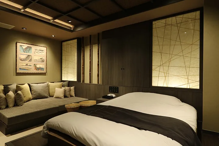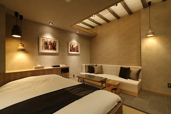 中でも注目の部屋は「301」。ブラウン・ベージュを基調に木目の温もりを重ねた、洗練と安らぎが共存するリラックス空間だ。絵画やヴィンテージ家具がアクセントとなり、まるで小さなギャラリーに滞在しているかのような趣が、ここでしか味わえない時間を演出する。奥行きのあるソファはふたりでゆったり過ごすのに最適。さらにエクストラベッドにも対応し、女子会で選ばれることも多い客室となっている。