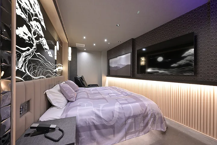 客室は一室ごとに違う表情を持ち、和・洋・アジアの要素が調和した28室が揃う。全室に65インチ以上の大型ネットテレビ、ウォーターサーバー、Wi-Fi、VOD、加湿空気清浄機、ジェット・バブルバス、ハンディーマッサージ機を完備。必要なものは厳選して備え、滞在の質を静かに高めている。カラオケを備えた部屋もあり、「KINUJO」のヘアドライヤーやヘアアイロン・コテなど、身美を意識したアメニティも充実している。
