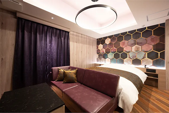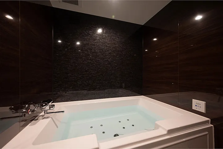 1階ホールに設けられた特大のシャンデリアが、訪れた瞬間に非日常へと誘い、印象的な時間の幕開けを告げる。客室に広がるのは、ふたりだけに許された、穏やかなひととき。全室に75インチ以上の大型テレビを備え、映画やスポーツを心ゆくまで楽しめるほか、広々とした浴槽でふたりゆったりとくつろぐことができる。こうした充実の設備が、ゲストから好評だ。