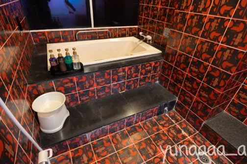 浴室は赤と黒のタイルが印象的。