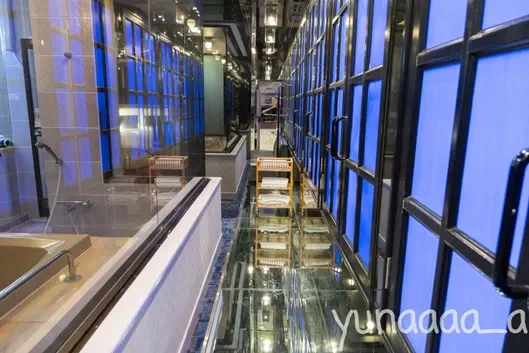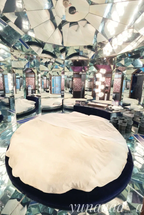 壁だけでなく床も天井も360度、鏡張り。そのせいか方向感覚が鈍くなり、ふわふわとした夢の中にいるような感覚になった。遊園地にある鏡の迷路に迷い込んだかのような錯覚も覚える。清掃をするのも大変なのでは?と思わず従業員目線になってしまったのはここだけの話。