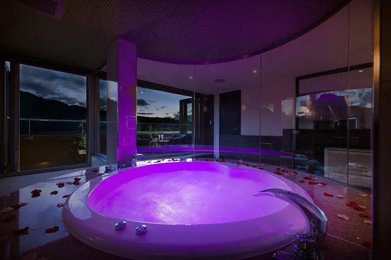 露天風呂のような展望風呂や岩盤浴、サウナでまったり癒しのリラクゼーション!ビリヤードやVR、キッチン、室内水槽、天蓋ベット、貝殻ベットなど遊び心あるバラエティ空間。高級マッサージチェア、大型プロジェクターなど盛り沢山の設備導入!