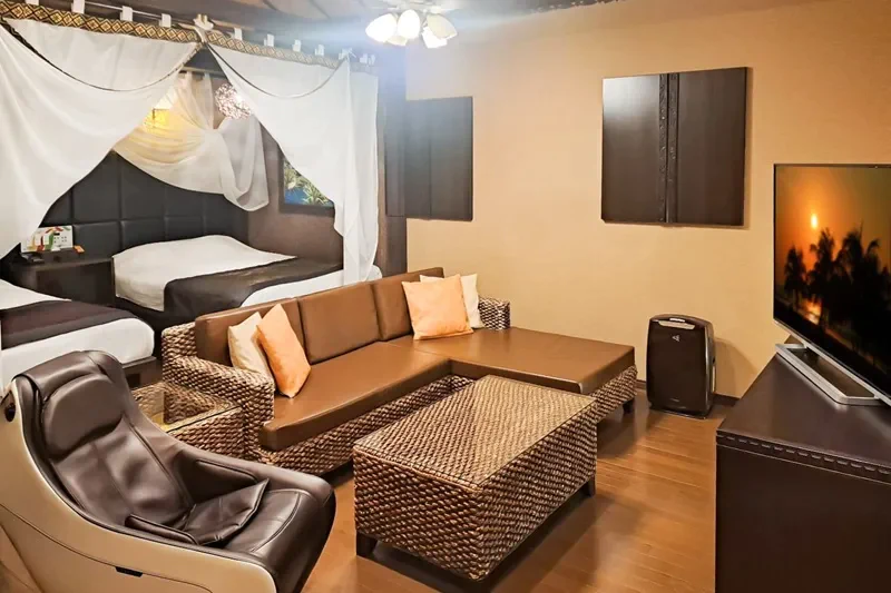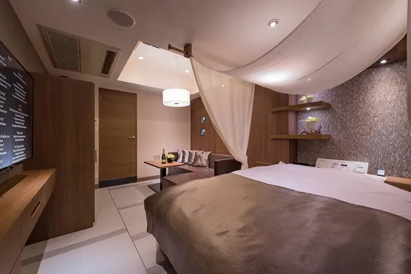 こちらはカップルで楽しめる客室設備や、人気のバラエティグッズが用意されているデザイナーズホテルです。客室は全35室あり、一部の部屋には岩盤浴や露天風呂、ミストサウナや流行りのハンギングチェアー(ゆりかご)が設置されており、多くの利用者からリピートされています。
