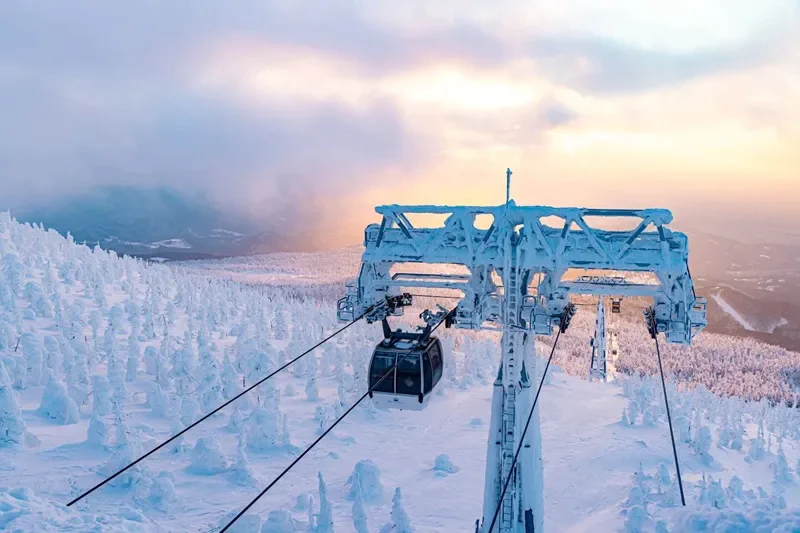 ロープウェイは、ロープウェイの各駅を乗り継ぎ山頂まで向かいます。山頂へ行く途中、空中から、自然が織りなす美しい樹氷を一望できます。違う視点を楽しめる、それぞれのルートや料金の詳細はこちらです。