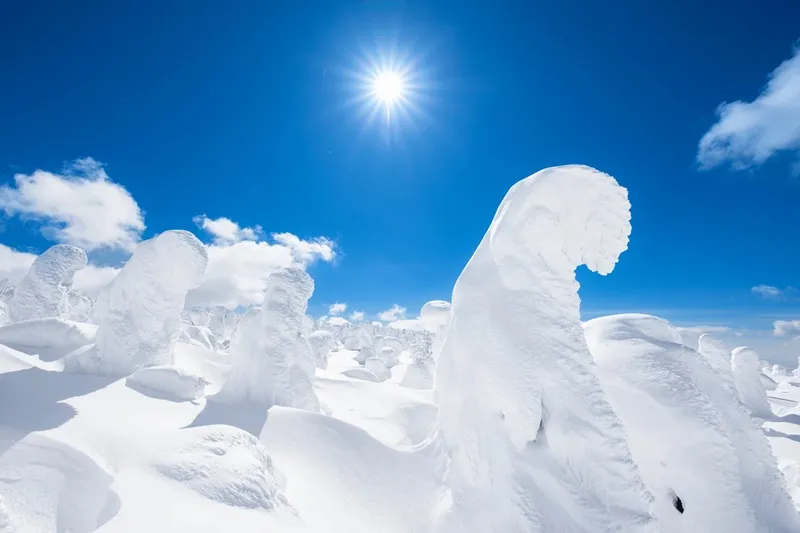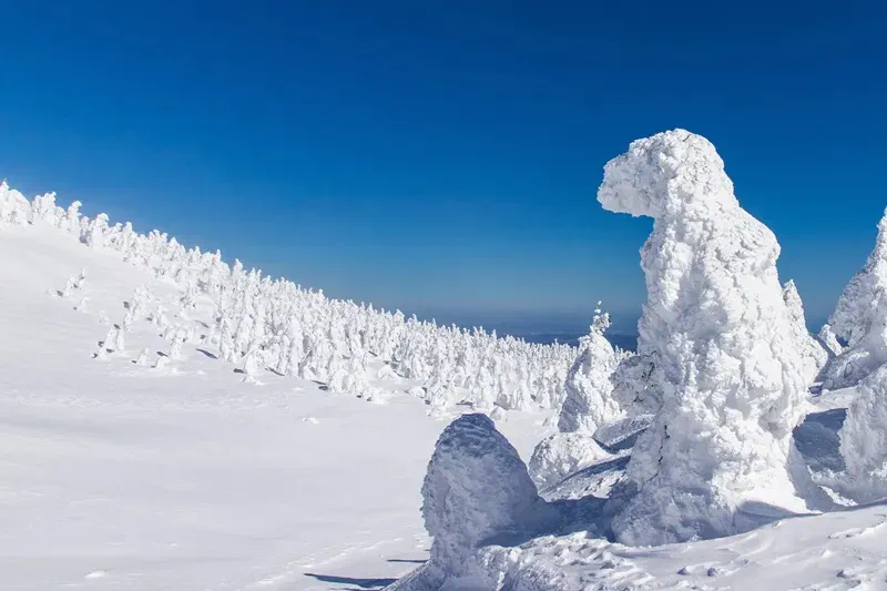 樹氷とは 、「風向きが一定方向」「アオモリトドマツ(常緑針葉樹)が自生している」「積雪が適量」という3つの気象条件が揃う、山形県と宮城県の県境にある蔵王連峰(ざおうれんぽう)でしか出現しない現象のことです。