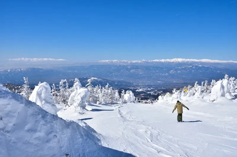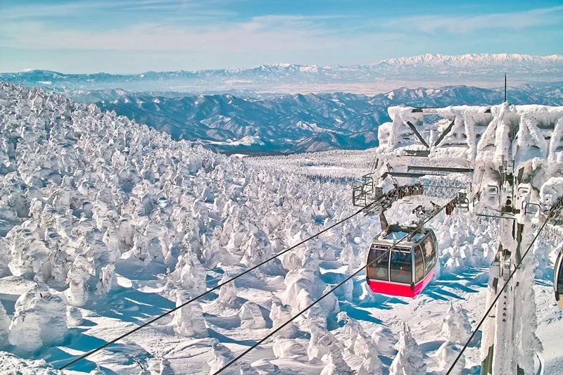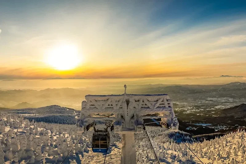 麓線(山麓駅〜樹氷高原駅)と山頂線(樹氷高原駅〜地蔵山頂駅)を乗り継ぎ、地蔵山頂を目指します。巨大な樹氷を空から眺めるような壮大な景色を味わえます。