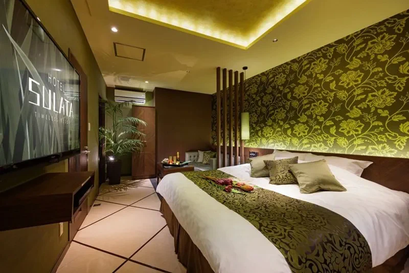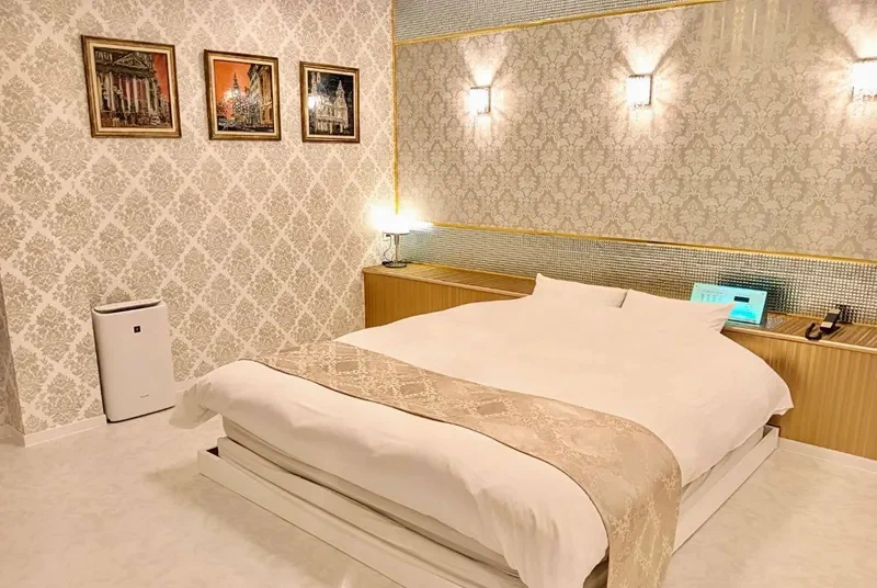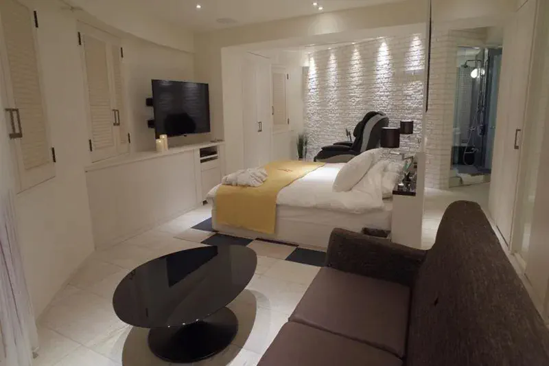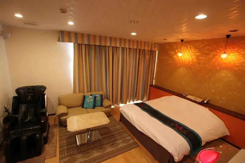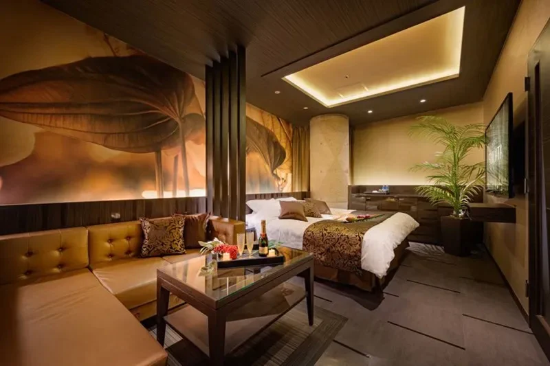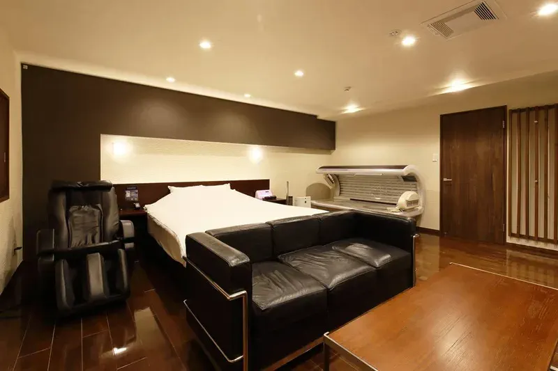 シンプルながら品の良さを感じるお部屋には、高級な設備が目白押しです。高級ジェットバスやオーバーヘッドシャワーなどのスパ設備をはじめ、最高クラスの国産マッサージチェア、コンディショニングマシーンなどほかのラブホテルでは見かけない設備が多数あります。充実したフード・ドリンクメニューがあるので巣ごもり利用にもおすすめです。
