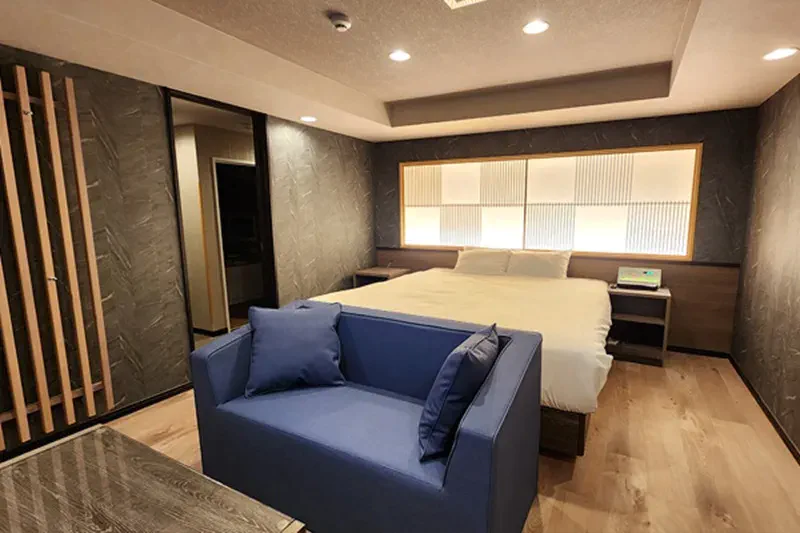 落ち着いたデザインのお部屋には、大型ジャグジーバスやカラオケを楽しめお部屋もあります。宿泊された方は、300円で朝食をいただくこともできます。