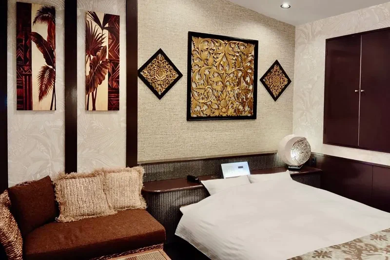 和モダンのおしゃれで落ち着いたデザインのお部屋からトレーニングマシンや日焼けマシンが設備されたお部屋まで様々なコンセプトのお部屋が楽しめます。本格的なドライサウナや浴室ミストなど男女共に嬉しい設備が豊富にあります。