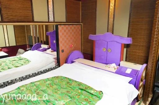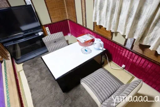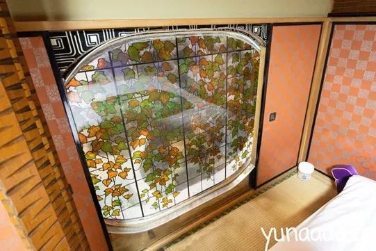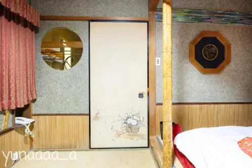 ベッドルーム側にある襖を開けると窓ガラスが出てきます。浴室の様子が見れるようになっていて、浴室からはベッドルームが見れるようになっています。カップルで行った場合は、ちょっと恥ずかしいですが、いつもとは気分を変えてガラス越しに互いの姿を鑑賞するのも楽しいかもしれませんね。