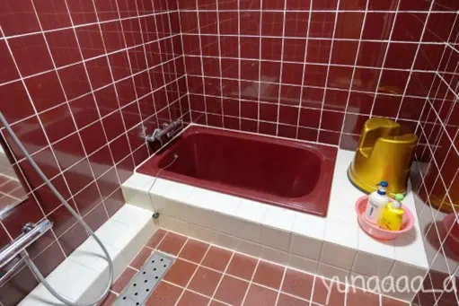 浴室は情熱的な深い赤色タイルが印象的。シャンプー類が洗面器の中に入っているのも、なんだか和む光景です。