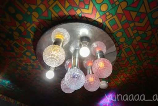 とくに、天井の照明デザインに惹かれました。カラフルな丸い照明が可愛らしく、いつまでも見ていられそうです。本当は青色の照明がつくはずなのですが、切れていました。天井の壁紙はツヤツヤとした質感で、模様もすごく好みです。自宅の天井もこの壁紙にしたいくらいです。