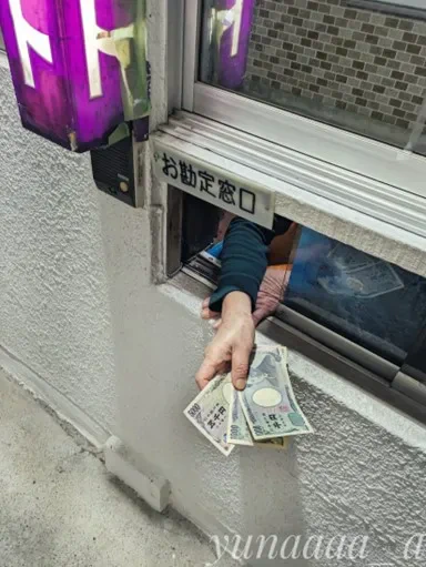 写真だと少しわかりにくいかもしれませんが、お会計がドライブスルー形式になっているんです!ご年配のスタッフ様だったのですが、手の皺がとてもいい味を出しています。