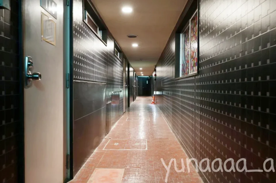 車を止めて駐車場のドアを開けると、この廊下につながっていて、客室に入れるドアがあります。