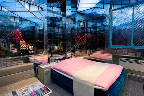 掛け布団のピンク色が、部屋の青照明にとても映えます。鏡張りの部屋に来るたびにちょっぴり不思議な気分になるのは私だけでしょうか。